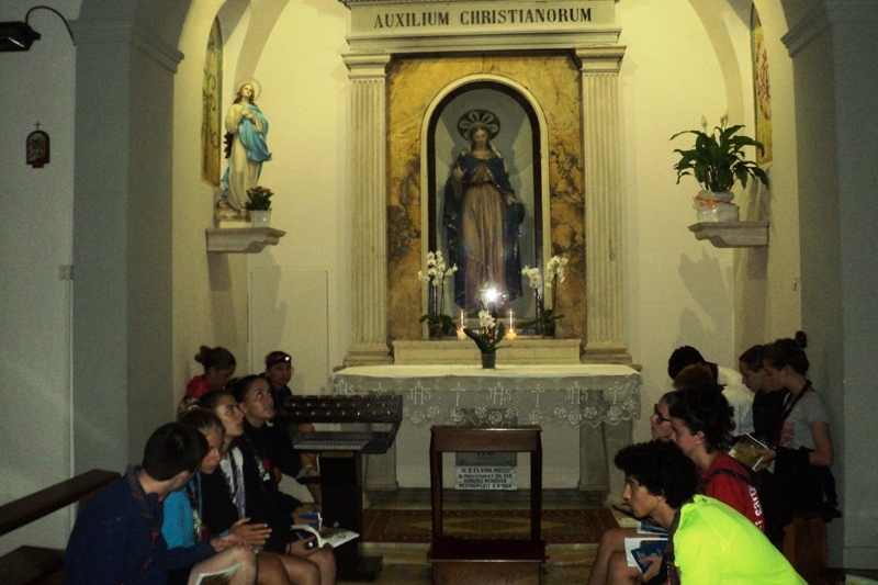 Successivamente abbiamo svolto un’attività organizzata dal nostro amico Dario dove dopo aver visto un filmato piuttosto criptico dovevamo interpretarne il significato. Conclusa l’attività siamo ritornati su un clima più tranquillo per la preghiera serale, gestita dalla nostra pattuglia liturgia (Valentina, Clara, Anna e Irene), nell’angolo preghiera costruito da noi. Finita la serata siamo andati a dormire per prepararci alla movimentata giornata successiva.